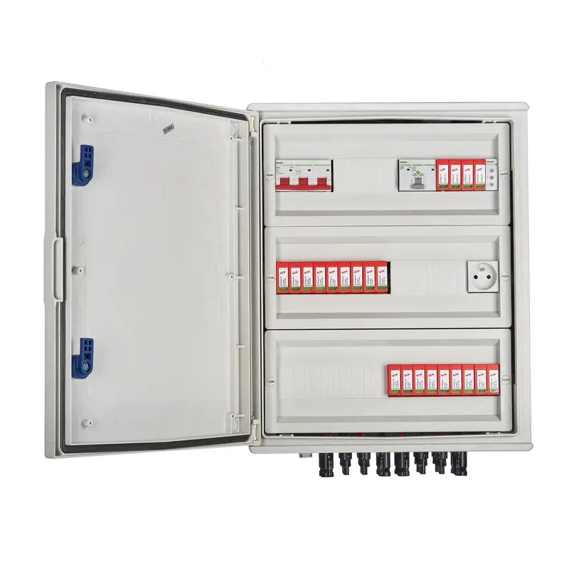 Anschlussschaltanlage DCAC hermetisch IP66 EMITER mit Überspannungsbegrenzer DC Dehn 1000 V Typ 2, 6x PV-Kette, 6x MPPT / Begrenzer AC Dehn Typ 2, 100 A 3-F, FR 100 A, Phasensig. + Steckdose