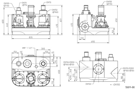 - 2 seitliche Muffen DN 150/ DN 50