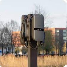 Doppelte EV-Ladestation von Peblar, die das gleichzeitige Laden von zwei Fahrzeugen ermöglicht.